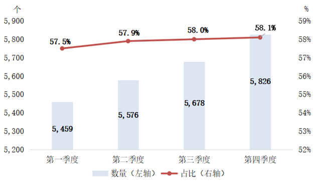 綠色PPP項目數(shù)量繼續(xù)保持平穩(wěn)增長,占比小幅增加。從綠色PPP項目數(shù)量看,項目數(shù)量保持平穩(wěn)增長,截至2020年末,累計綠色PPP項目數(shù)量達5826個,較2019年末新增410個,增加7.57%;綠色PPP項目占比進一步上升,從2019年末的57%提升到58.1%。