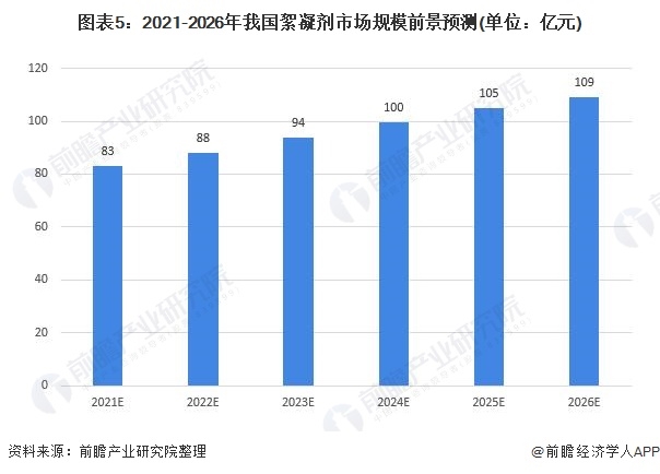在我國(guó)水資源短缺的同時(shí),我國(guó)水環(huán)境污染狀況日趨嚴(yán)重,目前全國(guó)約有1/3的工業(yè)廢水和4/5的生活廢水未經(jīng)處理就直接排入江、河、湖、海,使水環(huán)境遭到嚴(yán)重污染,直接影響到人民生活和經(jīng)濟(jì)的發(fā)展。在節(jié)約水資源和防治水污染背景下,絮凝劑市場(chǎng)具有著巨大的發(fā)展空間,預(yù)計(jì)到2026年我國(guó)我國(guó)絮凝劑市場(chǎng)規(guī)模將持續(xù)增長(zhǎng)到109億元。