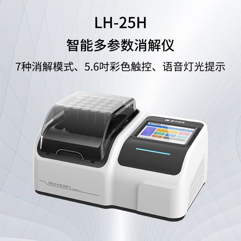 LH-25H智能型多參數(shù)水質(zhì)消解儀是連華科技自主研發(fā)的全新智能化水質(zhì)消解儀,可根據(jù)用戶需求定制型號,適用多種消解環(huán)境。5.6吋高清電容觸屏操作,通過智能PID溫度控制,大幅減小溫度示值誤差,提升溫場均勻性。內(nèi)置COD、總磷、總氮、高錳酸鹽指數(shù)、硫酸鹽、甲醛和自定義7種消解模式,適應(yīng)多種消解實驗需求。全新外觀架構(gòu),保護罩內(nèi)循環(huán)空氣流動,消解池頂部航空隔熱層設(shè)計讓消解流程更安全,中文智能語音播報、多色彩指示燈、引流槽設(shè)計、超溫斷電保護、上位機遠程控制等功能讓用戶操作更簡單、安全、便捷。