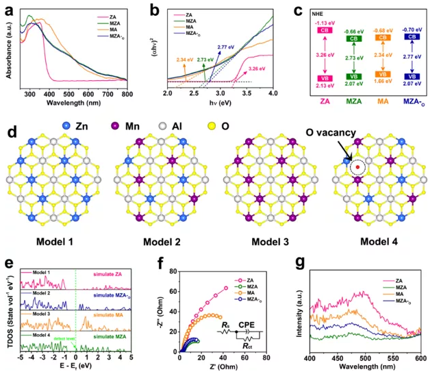 在本研究中,我們旨在揭示金屬取代效應(yīng)增強(qiáng)LDH光催化性能的機(jī)理,特別是闡明錳取代和氧空位對(duì)提高M(jìn)ZA光催化活性的貢獻(xiàn)。紫外可見(jiàn)吸收光譜(圖2a)和帶隙寬度(圖2b)顯示與ZA和MA相比,MZA的帶隙更適合光催化反應(yīng)。值得注意的是,MZA的帶隙比MZA-o略窄,這意味著帶隙的縮短不僅來(lái)自Mn取代,O空位在這個(gè)過(guò)程中也起到了一定的輔助作用。圖2c顯示了催化劑的能帶結(jié)構(gòu),觀察到MZA和MZA-o的價(jià)帶位置相近,而MZA的導(dǎo)帶低于MZA-o,說(shuō)明氧空位對(duì)縮短帶隙的作用機(jī)制是降低導(dǎo)帶。在密度泛函理論計(jì)算中我們補(bǔ)充了模型4(圖2d),即具有一個(gè)氧空位的模型2(氧空位位置的選擇遵循最低總能量的原則),并計(jì)算了模型1-4的總態(tài)密度(TDOS)。如圖2e所示,模型的帶隙順序與圖2b中實(shí)驗(yàn)確定的帶隙結(jié)果一致,其中模型2和模型4具有非常相似的能帶結(jié)構(gòu),兩者的區(qū)別在于模型4的能帶結(jié)構(gòu)中出現(xiàn)了一個(gè)明顯的中間能級(jí),這表明O空位對(duì)縮短帶隙的貢獻(xiàn)是通過(guò)缺陷能級(jí)的形成來(lái)實(shí)現(xiàn)的。因此我們認(rèn)為Mn取代和O空位的協(xié)同作用是帶隙縮短的原因,其中Mn取代的貢獻(xiàn)占主導(dǎo)地位,O空位的作用相對(duì)較弱。此外,催化劑的阻抗譜(圖2f)和穩(wěn)態(tài)熒光光譜(圖2g)的結(jié)果進(jìn)一步證實(shí)了MZA的優(yōu)異光催化活性歸因于Mn取代和O空位,并且在提高載流子轉(zhuǎn)移能力方面,Mn取代的貢獻(xiàn)仍然大于O空位。