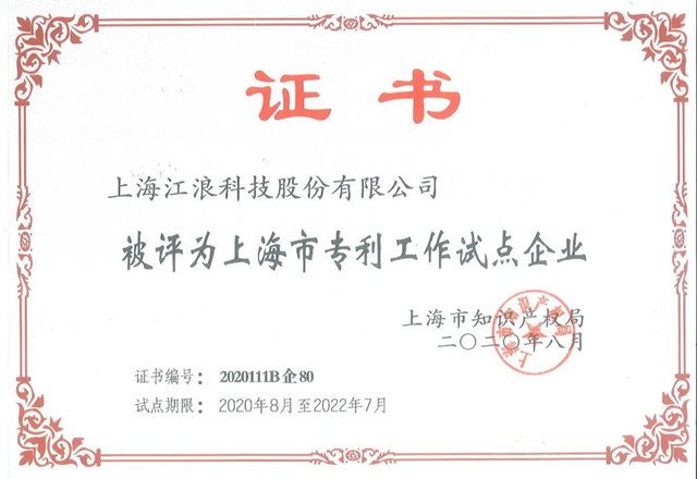 根據《上海市企事業(yè)專利工作試點示范單位認定和管理辦法》(滬知局﹝2017﹞62號)的要求,通過專家評審等程序,并經市知識產權局黨組會審議,網上公示等一系列嚴格程序,江浪科技憑借在專利工作領域的優(yōu)異表現,被評為上海市專利工作試點企業(yè)。