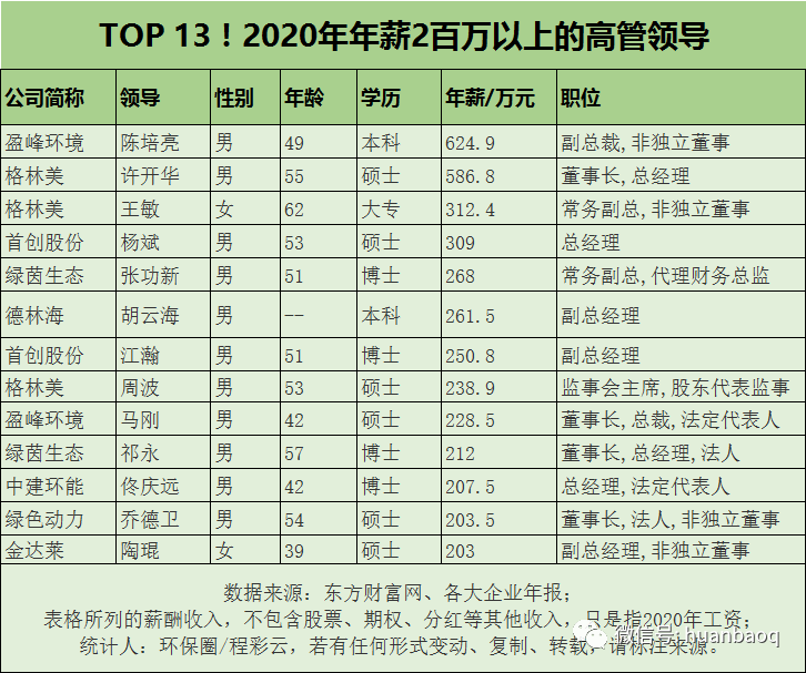 圖二:年薪過200萬的13位上市環(huán)企高管