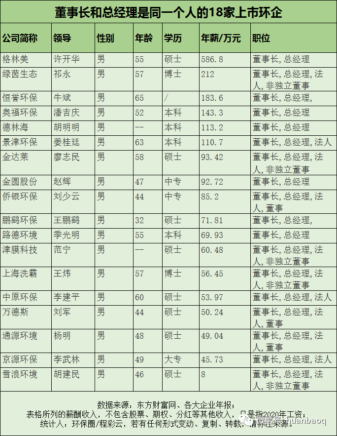 事實上,在統(tǒng)計董事長薪資收入時,我們發(fā)現(xiàn)了一個有趣的現(xiàn)象——好多上市環(huán)企,副總、總經(jīng)理的年薪都要高于董事長!甚至有的董事長(如首創(chuàng)股份劉永政),都沒有在公司領(lǐng)取任何報酬!