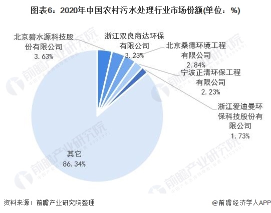 目前,北京碧水源科技股份有限公司村鎮(zhèn)污水處理項(xiàng)目總規(guī)模,市占率約為3.63%;其次是浙江雙良商達(dá)環(huán)保有限公司、北京桑德環(huán)境工程有限公司、寧波正清環(huán)保工程有限公司和浙江愛迪曼環(huán)??萍脊煞萦邢薰?,市占率分別為3.23%、2.84%、2.23%和1.73%。