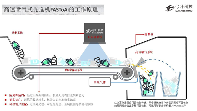 弓葉科技自主研發(fā)的智能垃圾分選裝備已實(shí)現(xiàn)落地應(yīng)用,目前參與了國(guó)內(nèi)多個(gè)垃圾處理項(xiàng)目,其中包含混合生活垃圾、可回收垃圾、廚余垃圾、餐廚垃圾、建筑垃圾等領(lǐng)域。同時(shí),弓葉科技還將其剛推出的高速噴氣式光選機(jī)FASToAI運(yùn)用到了醫(yī)療廢棄物處理領(lǐng)域中,幫助醫(yī)療機(jī)構(gòu)及醫(yī)廢處置單位降本增效,實(shí)現(xiàn)了對(duì)醫(yī)用級(jí)塑料垃圾的準(zhǔn)確分選,同時(shí)大大降低了醫(yī)療工作人員垃圾分類的工作量與時(shí)間成本。