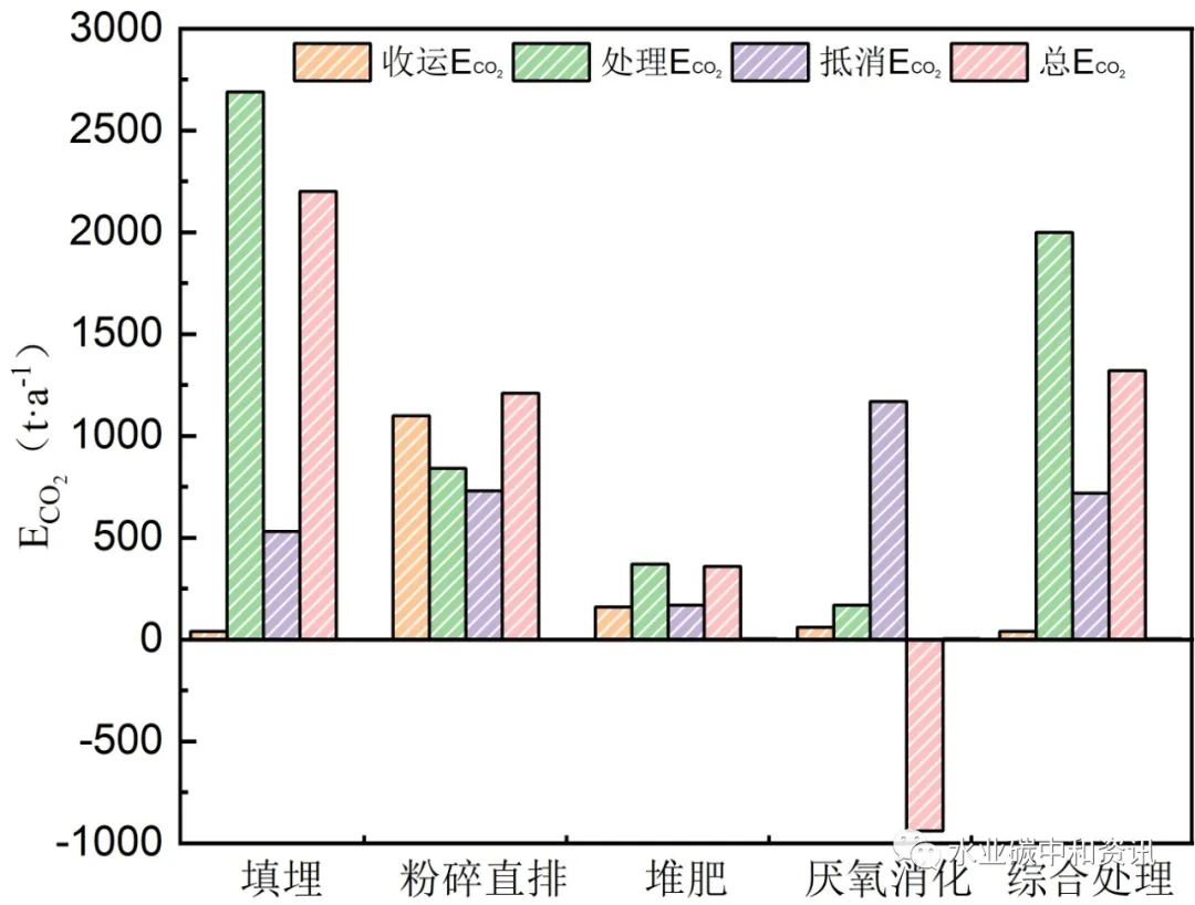 評估的LCA包括餐廚垃圾收集與運輸、處理、產(chǎn)物各個處置環(huán)節(jié);LCA之碳排放涉及的溫室氣體包括CO2、N2O和CH4;N2O和CH4造成的溫室效應(yīng)分別乘以298、25折算為CO2當(dāng)量——ECO2。經(jīng)微生物分解代謝作用產(chǎn)生的CO2為生物成因(生源性),是有機物的自然歸宿,不列入碳排放計算;產(chǎn)生的CH4經(jīng)回收后用于發(fā)電或熱電聯(lián)產(chǎn)(CHP),這一途徑形成的碳排放不納入LCA碳排放匯總與計算。被回收的能源與資源可相應(yīng)地抵消碳排放量,主要包括由CH4用于發(fā)電或CHP后回收的電能或(和)熱能與可用作肥料的沼渣;產(chǎn)生的熱能除滿足自身升溫需求之外,未利用的剩余熱能不計入抵消ECO2項目內(nèi)。每kW·h電能可抵消0.608 kg ECO2,每kg肥料(以N計)可抵消4 kg ECO2。據(jù)此計算各餐廚垃圾處置方式對應(yīng)的年ECO2數(shù)據(jù)(圖3)。