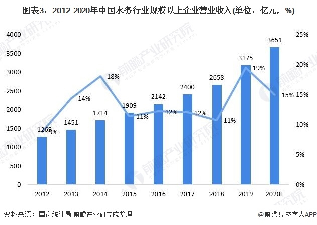 隨著我國供排水規(guī)模的逐步擴(kuò)大,我國水務(wù)行業(yè)市場規(guī)模穩(wěn)步增長。2012年,我國水務(wù)行業(yè)規(guī)模以上企業(yè)營業(yè)收入僅為1269億元;到2019年,規(guī)模以上企業(yè)實現(xiàn)營業(yè)收入3175億元,同比增長19%。前瞻以15%的增速估計,2020年,水務(wù)行業(yè)規(guī)模以上企業(yè)營業(yè)收入約為3651.1億元。