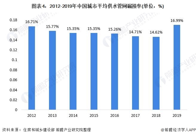 在我國水務(wù)行業(yè)市場規(guī)模的擴(kuò)大的同時,我國水務(wù)行業(yè)仍存在一些痛點。例如,我國供水管網(wǎng)漏損率仍處于較高水平。2012-2018年,我國城市供水管網(wǎng)漏損率從16.71%下降至14.62%。2019年,我國供水管網(wǎng)漏損率小幅上升,增至16.99%。