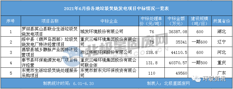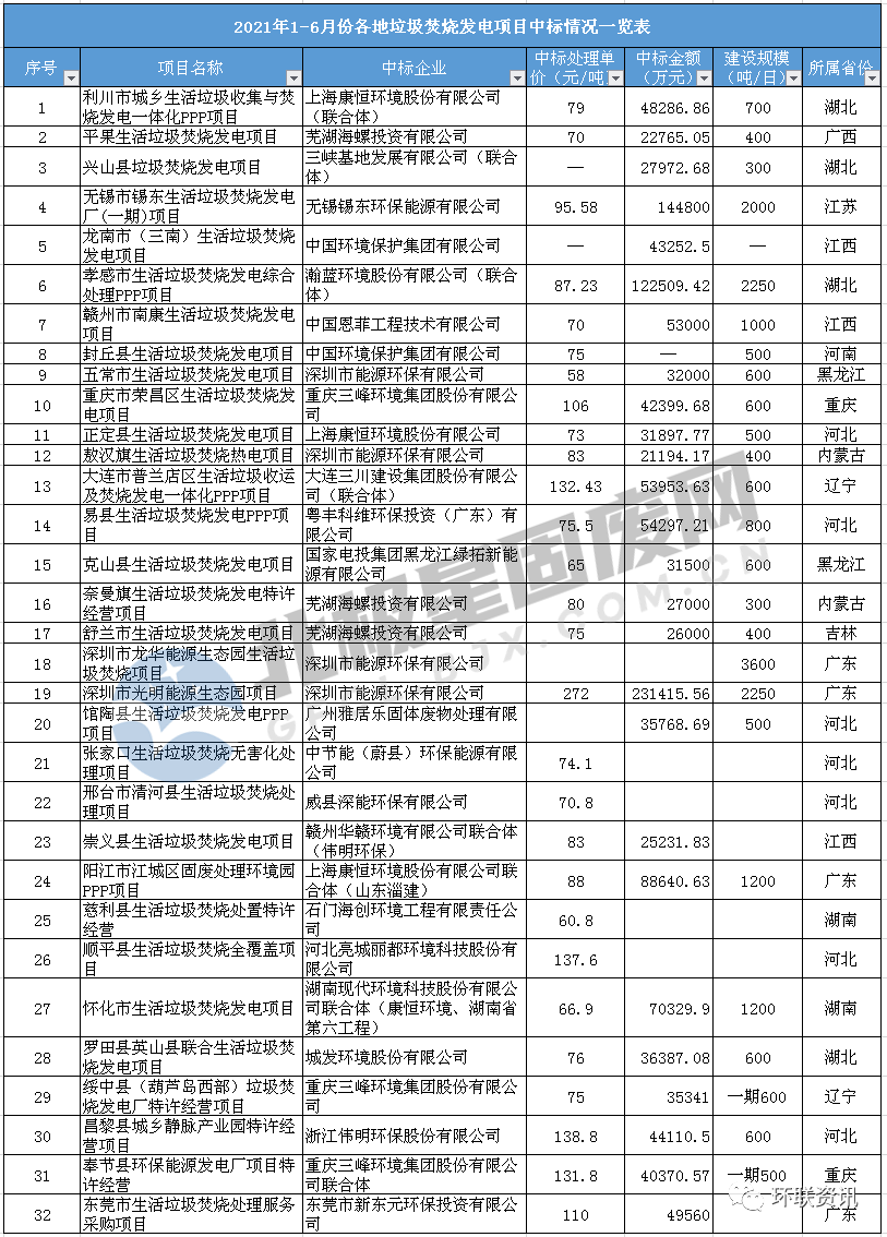 附:1-6月全國垃圾焚燒發(fā)電項目中標(biāo)信息匯總(如有遺漏,敬請諒解)