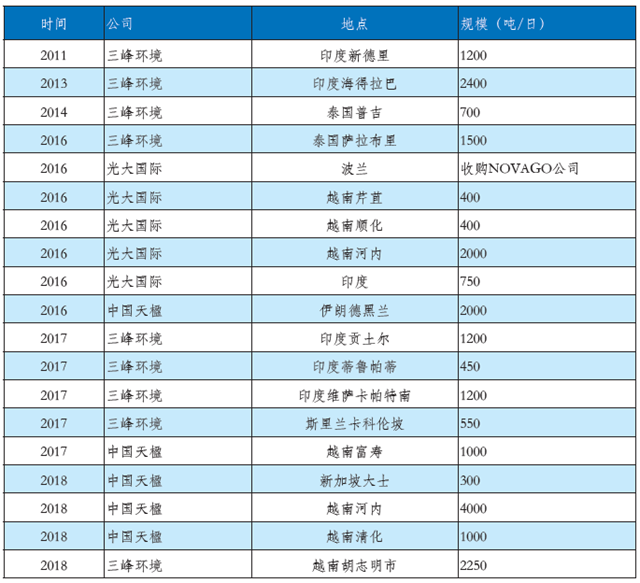在固廢領(lǐng)域,具備自主設(shè)備制造能力的三峰環(huán)境、光大國際、中國天楹等企業(yè)也已經(jīng)成功邁出國際化的堅(jiān)實(shí)一步。以三峰環(huán)境為例,2013年投資并運(yùn)營多座生活垃圾填埋場、危險(xiǎn)廢物處理廠、垃圾資源化回收利用廠以及生活垃圾發(fā)電廠。同年,隆企集團(tuán)贏得印度首批垃圾發(fā)電項(xiàng)目,確定與三峰環(huán)境合作,并采用三峰環(huán)境提供的設(shè)備和技術(shù)方案。目前三峰環(huán)境的技術(shù)設(shè)備已應(yīng)用到美國、印度、埃塞俄比亞、泰國、斯里蘭卡、越南、巴西等七個(gè)國家的垃圾焚燒發(fā)電項(xiàng)目。