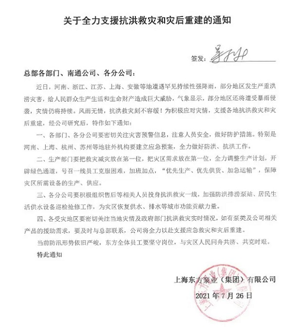 面對災情,上海東方泵業(yè)(集團)有限公司董事長吳永旭先生第一時間提出要求:搶先救災減災,全力調(diào)整生產(chǎn)計劃,開辟綠色通道,優(yōu)先保障災區(qū)所需給排水設備的生產(chǎn)、供應;各分公司要組織人員積極投身抗洪救災一線,加強防洪排澇泵站、居民生活供水設備巡檢搶修工作;各駐外機構要積極聯(lián)系相關管理部門,了解災區(qū)實際需求,只要災區(qū)有需要,上海東方泵業(yè)(集團)有限公司一定全力以赴支援應急救災和災后重建。