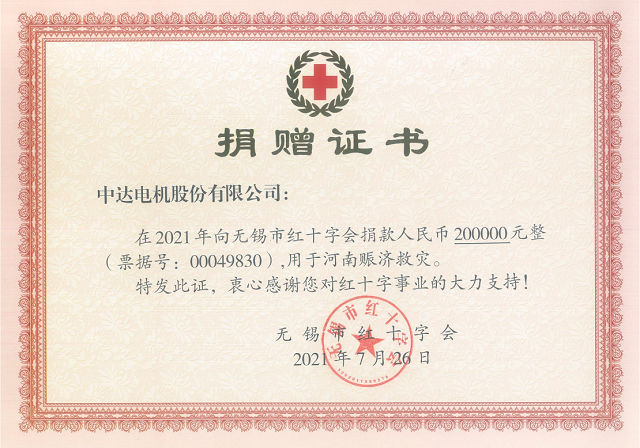 近日,河南暴雨成災,特別是鄭州、新鄉(xiāng)等地受災嚴重,牽動著全國人民的心。中達電機股份有限公司一直心系救援情況和受災群眾,通過無錫紅十字會向河南捐款人民幣200000元整,用于物資采購及災后重建工作。中達電機股份有限公司愿災區(qū)群眾能夠早日恢復正常生活,并向所有奮戰(zhàn)在一線搶險救援的工作人員和組織機構致以最崇高的敬意!