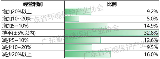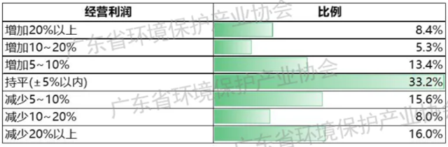 營(yíng)業(yè)利潤(rùn)方面,27.1%的環(huán)保企業(yè)實(shí)現(xiàn)利潤(rùn)同比增長(zhǎng),33.2%的企業(yè)利潤(rùn)與上年同期持平,39.7%的企業(yè)利潤(rùn)下降。