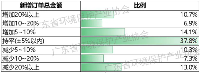 新增訂單方面,32.4%的環(huán)保企業(yè)認(rèn)為較去年同期增加,37.8%的企業(yè)同比基本持平,29.8%的企業(yè)反映新增訂單減少。