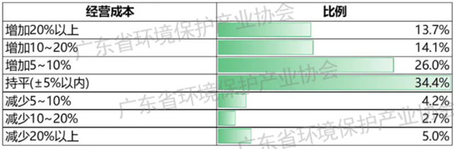 經(jīng)營(yíng)成本方面,環(huán)保企業(yè)經(jīng)營(yíng)成本普遍上升。調(diào)查企業(yè)中,53.8%的環(huán)保企業(yè)反饋成本同比上升,34.4%的環(huán)保企業(yè)基本持平,僅有11.8%的企業(yè)反饋成本下降。