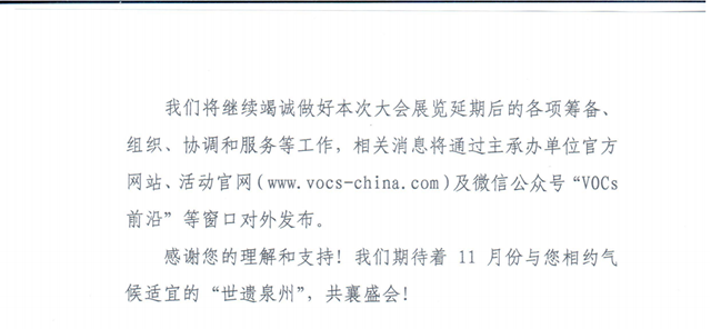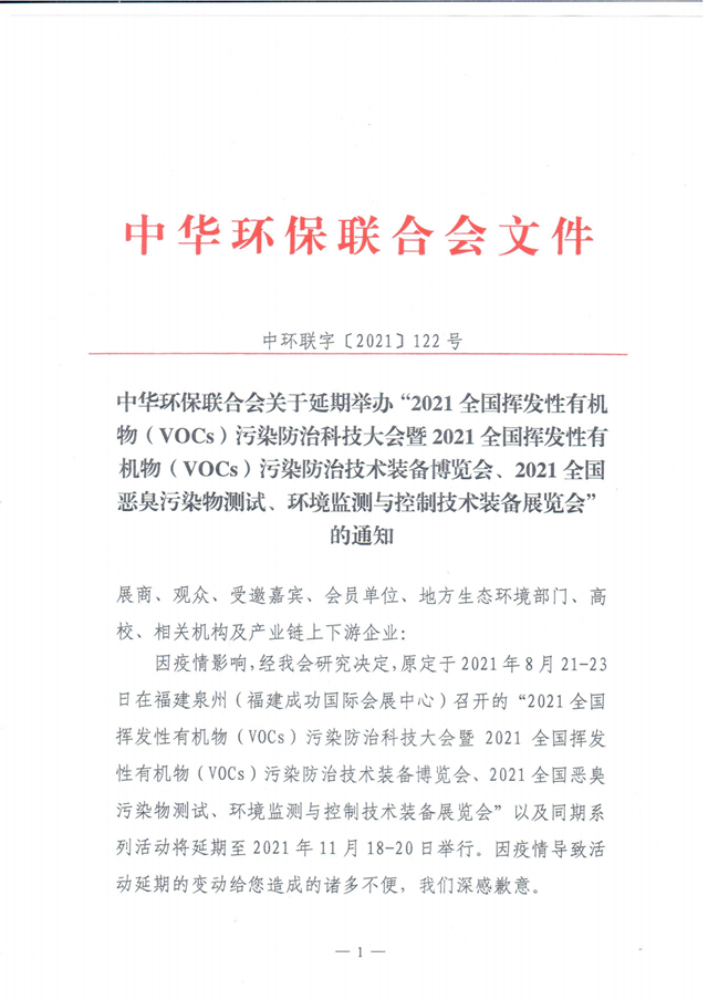 因近期國(guó)內(nèi)疫情防控形勢(shì)趨于嚴(yán)峻,環(huán)保在線記者從中華環(huán)保聯(lián)合會(huì)獲悉,為切實(shí)保障嘉賓、展商和觀眾的身體健康,經(jīng)主辦單位研究決定,原定于2021年8月21-23日在福建泉州(福建成功國(guó)際會(huì)展中心)召開(kāi)的“2021全國(guó)揮發(fā)性有機(jī)物(VOCs)污染防治科技大會(huì)暨2021全國(guó)揮發(fā)性有機(jī)物(VOCs)污染防治技術(shù)裝備博覽會(huì)、2021全國(guó)惡臭污染物測(cè)試、環(huán)境監(jiān)測(cè)與控制技術(shù)裝備展覽會(huì)”以及同期系列活動(dòng)將延期至2021年11月18-20日舉行,活動(dòng)地點(diǎn)不變。相關(guān)消息將通過(guò)主承辦單位網(wǎng)站、活動(dòng)及微信公眾號(hào)“VOCs前沿”、戰(zhàn)略合作媒體“環(huán)保在線”等窗口對(duì)外發(fā)布。