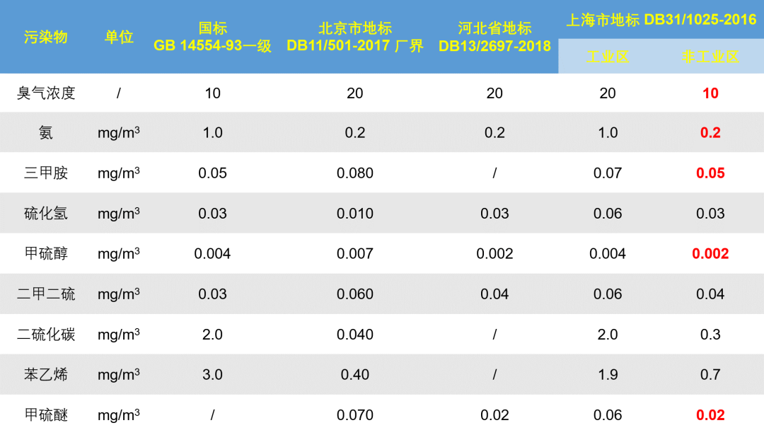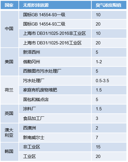 大多數(shù)國家和地區(qū)的臭氣濃度標(biāo)準(zhǔn)用于污染管理指導(dǎo),規(guī)定臭氣濃度標(biāo)準(zhǔn)的應(yīng)用范圍不盡相同。不同地區(qū)使用的臭氣濃度由于測量方式差異導(dǎo)致單位不同:如澳大利亞使用OU、荷蘭使用OUE/m3、美國使用D/T,韓國使用OC,而國際上對臭氣濃度的定義是一致的,因此1OU=1OU/m3 = 1OUE/m3 = 1OC= 1D/T。上海市《惡臭(異味)污染物排放標(biāo)準(zhǔn)》(DB31/1025-2016)規(guī)定的非工業(yè)區(qū)臭氣濃度及氨、三甲胺、甲硫醇、甲硫醚等組分濃度在國內(nèi)均最嚴(yán)。