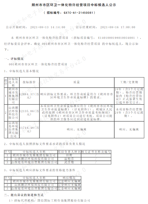 原標(biāo)題:朔州市市區(qū)環(huán)衛(wèi)一體化特許經(jīng)營(yíng)項(xiàng)目中標(biāo)候選人公示