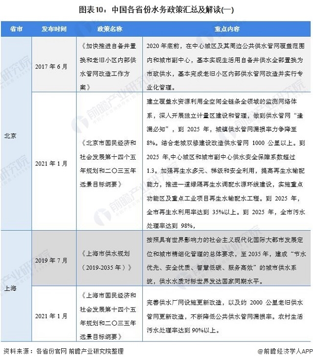 目前,我國各省市均出臺了水務(wù)相關(guān)的“十四五”政策規(guī)劃,在供水、污水處理、再生水利用等方面做出了規(guī)劃。除此之外,上海和天津還發(fā)布了至2035年的供水規(guī)劃政策,政策內(nèi)容均落實(shí)了安全、節(jié)水的主旨: