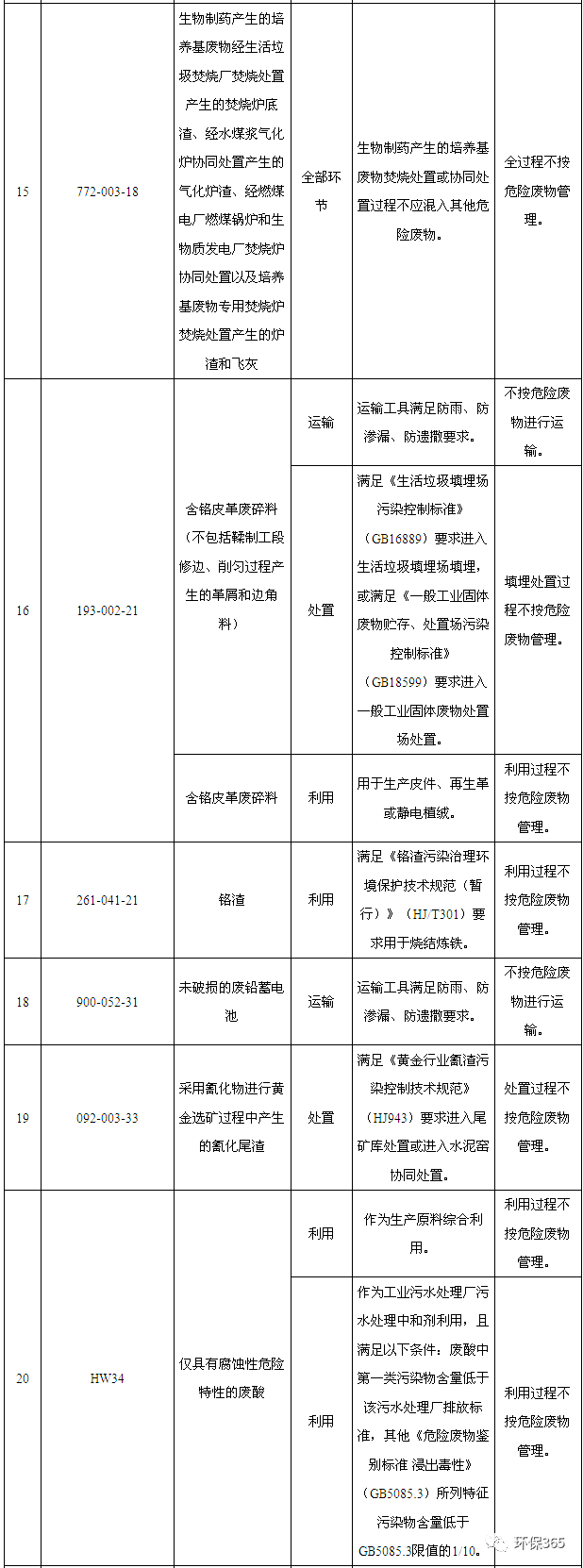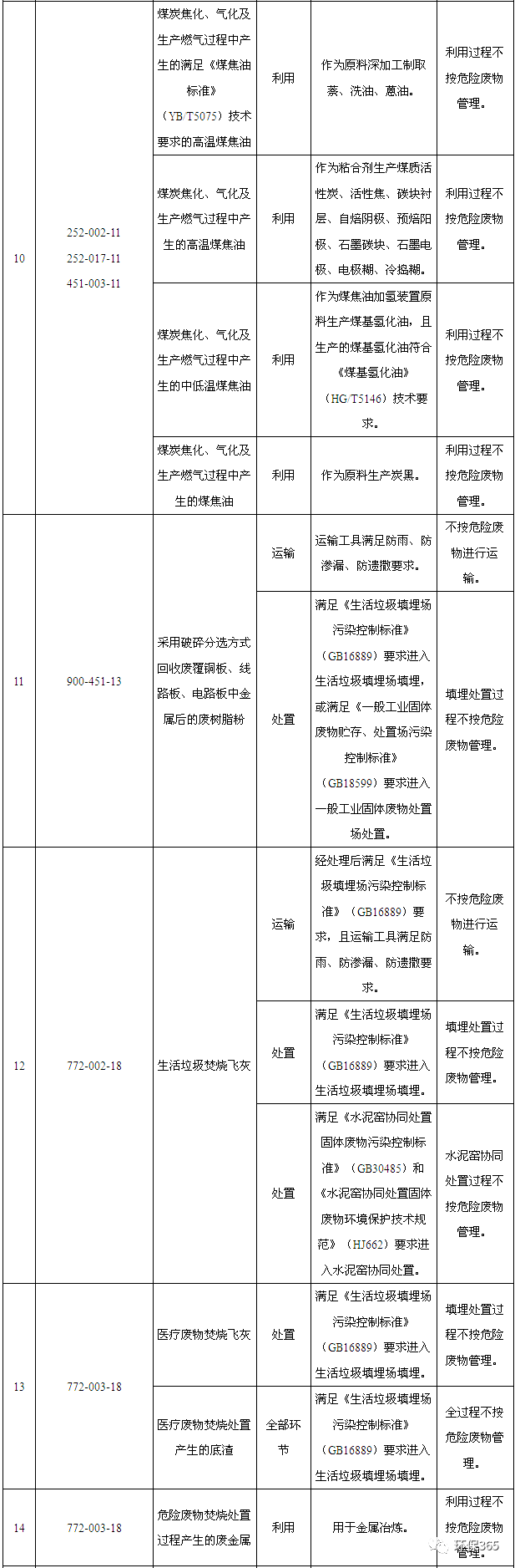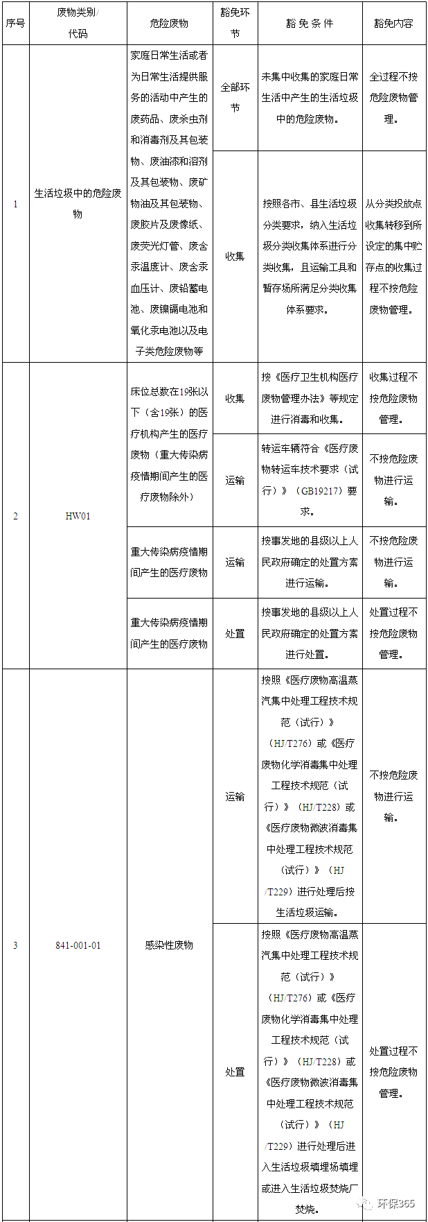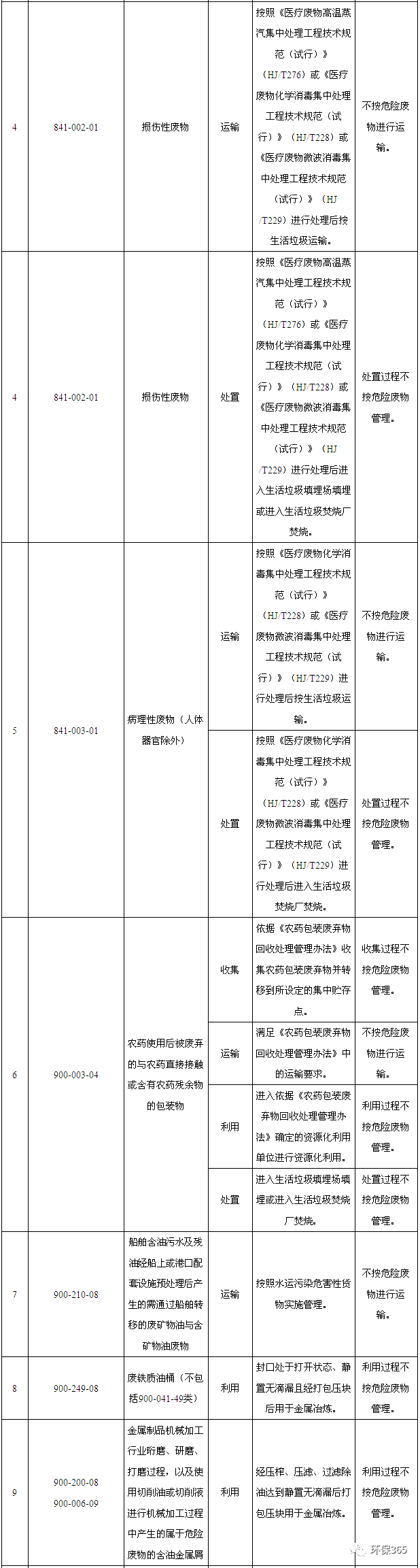 (1)家庭日常生活或者為日常生活提供服務(wù)的活動(dòng)中產(chǎn)生的廢藥品、廢殺蟲劑和消毒劑及其包裝物、廢油漆和溶劑及其包裝物、廢礦物油及其包裝物、廢膠片及廢像紙、廢熒光燈管、廢含汞溫度計(jì)、廢含汞血壓計(jì)、廢鉛蓄電池、廢鎳鎘電池和氧化汞電池以及電子類危險(xiǎn)廢物等未經(jīng)過集中收集的全部環(huán)節(jié)不按危險(xiǎn)廢物管理;按照各市、縣生活垃圾分類要求,納入生活垃圾分類收集體系進(jìn)行分類收集,且運(yùn)輸工具和暫存場所滿足分類收集體系要求的,從分類投放點(diǎn)收集轉(zhuǎn)移到所設(shè)定的集中貯存點(diǎn)的收集過程不按危險(xiǎn)廢物管理。(2)床位總數(shù)在19張以下(含19張)的醫(yī)療機(jī)構(gòu)產(chǎn)生的醫(yī)療廢物(重大傳染病疫情期間產(chǎn)生的醫(yī)療廢物除外)按《醫(yī)療衛(wèi)生機(jī)構(gòu)醫(yī)療廢物管理辦法》等規(guī)定進(jìn)行消毒和收集的,收集過程不按危險(xiǎn)廢物管理;轉(zhuǎn)運(yùn)車輛符合《醫(yī)療廢物轉(zhuǎn)運(yùn)車技術(shù)要求(試行)》(GB19217)要求的,不按危險(xiǎn)廢物進(jìn)行運(yùn)輸;重大傳染病疫情期間產(chǎn)生的醫(yī)療廢物,按事發(fā)地的縣級以上人民政府確定的處置方案進(jìn)行運(yùn)輸?shù)模话次kU(xiǎn)廢物進(jìn)行運(yùn)輸;按事發(fā)地的縣級以上人民政府確定的處置方案進(jìn)行處置的,處置過程不按危險(xiǎn)廢物管理。(3)感染性廢物按照《醫(yī)療廢物高溫蒸汽集中處理工程技術(shù)規(guī)范(試行)》(HJ/T276)或《醫(yī)療廢物化學(xué)消毒集中處理工程技術(shù)規(guī)范(試行)》(HJ/T228)或《醫(yī)療廢物微波消毒集中處理工程技術(shù)規(guī)范(試行)》(HJ/T229)進(jìn)行處理后按生活垃圾運(yùn)輸?shù)?,不按危險(xiǎn)廢物進(jìn)行運(yùn)輸;按照《醫(yī)療廢物高溫蒸汽集中處理工程技術(shù)規(guī)范(試行)》(HJ/T276)或《醫(yī)療廢物化學(xué)消毒集中處理工程技術(shù)規(guī)范(試行)》(HJ/T228)或《醫(yī)療廢物微波消毒集中處理工程技術(shù)規(guī)范(試行)》(HJ/T229)進(jìn)行處理后進(jìn)入生活垃圾填埋場填埋或進(jìn)入生活垃圾焚燒廠焚燒的,處置過程不按危險(xiǎn)廢物管理。(4)損傷性廢物按照《醫(yī)療廢物高溫蒸汽集中處理工程技術(shù)規(guī)范(試行)》(HJ/T276)或《醫(yī)療廢物化學(xué)消毒集中處理工程技術(shù)規(guī)范(試行)》(HJ/T228)或《醫(yī)療廢物微波消毒集中處理工程技術(shù)規(guī)范(試行)》(HJ/T229)進(jìn)行處理后按生活垃圾運(yùn)輸?shù)模话次kU(xiǎn)廢物進(jìn)行運(yùn)輸;按照《醫(yī)療廢物高溫蒸汽集中處理工程技術(shù)規(guī)范(試行)》(HJ/T276)或《醫(yī)療廢物化學(xué)消毒集中處理工程技術(shù)規(guī)范(試行)》(HJ/T228)或《醫(yī)療廢物微波消毒集中處理工程技術(shù)規(guī)范(試行)》(HJ/T229)進(jìn)行處理后進(jìn)入生活垃圾填埋場填埋或進(jìn)入生活垃圾焚燒廠焚燒的,處置過程不按危險(xiǎn)廢物管理。(5)病理性廢物(人體器官除外)按照《醫(yī)療廢物化學(xué)消毒集中處理工程技術(shù)規(guī)范(試行)》(HJ/T228)或《醫(yī)療廢物微波消毒集中處理工程技術(shù)規(guī)范(試行)》(HJ/T229)進(jìn)行處理后按生活垃圾運(yùn)輸?shù)?,不按危險(xiǎn)廢物進(jìn)行運(yùn)輸;按照《醫(yī)療廢物化學(xué)消毒集中處理工程技術(shù)規(guī)范(試行)》(HJ/T228)或《醫(yī)療廢物微波消毒集中處理工程技術(shù)規(guī)范(試行)》(HJ/T229)進(jìn)行處理后進(jìn)入生活垃圾焚燒廠焚燒的,處置過程不按危險(xiǎn)廢物管理。(6)農(nóng)藥使用后被廢棄的與農(nóng)藥直接接觸或含有農(nóng)藥殘余物的包裝物依據(jù)《農(nóng)藥包裝廢棄物回收處理管理辦法》收集并轉(zhuǎn)移到所設(shè)定的集中貯存點(diǎn)的,收集過程不按危險(xiǎn)廢物管理;滿足《農(nóng)藥包裝廢棄物回收處理管理辦法》中的運(yùn)輸要求的,不按危險(xiǎn)廢物進(jìn)行運(yùn)輸;進(jìn)入依據(jù)《農(nóng)藥包裝廢棄物回收處理管理辦法》確定的資源化利用單位進(jìn)行資源化利用的,利用過程不按危險(xiǎn)廢物管理;進(jìn)入生活垃圾填埋場填埋或進(jìn)入生活垃圾焚燒廠焚燒的,處置過程不按危險(xiǎn)廢物管理。(7)船舶含油污水及殘油經(jīng)船上或港口配套設(shè)施預(yù)處理后產(chǎn)生的需通過船舶轉(zhuǎn)移的廢礦物油與含礦物油廢物按照水運(yùn)污染危害性貨物實(shí)施管理的,不按危險(xiǎn)廢物進(jìn)行運(yùn)輸。(8)廢鐵質(zhì)油桶(不包括900-041-49類)封口處于打開狀態(tài)、靜置無滴漏且經(jīng)打包壓塊后用于金屬冶煉的,利用過程不按危險(xiǎn)廢物管理。(9)金屬制品機(jī)械加工行業(yè)珩磨、研磨、打磨過程,以及使用切削油或切削液進(jìn)行機(jī)械加工過程中產(chǎn)生的屬于危險(xiǎn)廢物的含油金屬屑經(jīng)壓榨、壓濾、過濾除油達(dá)到靜置無滴漏后打包壓塊用于金屬冶煉的,利用過程不按危險(xiǎn)廢物管理。(10)煤炭焦化、氣化及生產(chǎn)燃?xì)膺^程中產(chǎn)生的滿足《煤焦油標(biāo)準(zhǔn)》(YB/T5075)技術(shù)要求的高溫煤焦油作為原料深加工制取萘、洗油、蒽油的,利用過程不按危險(xiǎn)廢物管理。煤炭焦化、氣化及生產(chǎn)燃?xì)膺^程中產(chǎn)生的高溫煤焦油作為粘合劑
