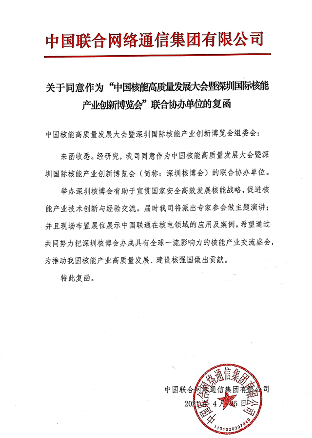 旨在宣貫國家安全高效發(fā)展核能戰(zhàn)略,落實中央堅持聚焦能源數(shù)字化轉(zhuǎn)型的重大需求,促進(jìn)互聯(lián)網(wǎng)+與核電融合發(fā)展,打造“5G+智慧核電”模式,推動我國核電產(chǎn)業(yè)高質(zhì)量發(fā)展,為我國建設(shè)核電強(qiáng)國、能源強(qiáng)國貢獻(xiàn)力量,中國聯(lián)合網(wǎng)絡(luò)通信集團(tuán)有限公司(以下簡稱“中國聯(lián)通”)同意作為2021深圳核博會聯(lián)合協(xié)辦單位。