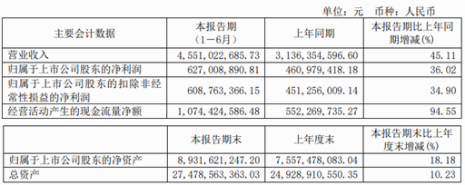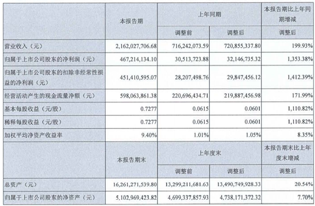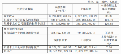 截至報(bào)告期內(nèi),公司經(jīng)營(yíng)狀況持續(xù)走高,實(shí)現(xiàn)營(yíng)業(yè)收入21.62億元,較上年增長(zhǎng)199.93%;實(shí)現(xiàn)歸母凈利潤(rùn)51.03億元,較上年增長(zhǎng)7.7%。