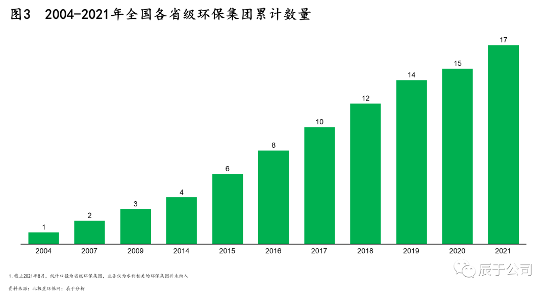 從“十二五”開始,就有地方生態(tài)環(huán)保集團成立,但“十三五”中后期至今頻率明顯變高。例如,初步統(tǒng)計已有超過20家省級生態(tài)環(huán)保集團,大多都是在“十三五”后期成立的,大概每年都會有2~3家(見圖3)。