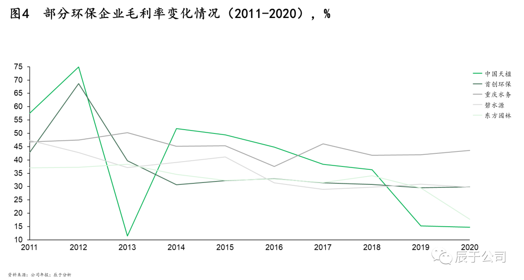 因此,地方政府一方面想辦法壓低項目盈利水平降低投入,一方面尋求其他“合法”融資渠道解困。近年來大型生態(tài)環(huán)保企業(yè)的盈利水平逐步下降印證了項目盈利降低的趨勢(見圖),盈利就幾個點,融資成本極低的大型國企、央企在競爭中處于優(yōu)勢,幾個點的融資成本決定了項目的成與否;尋找融資渠道下,地方生態(tài)環(huán)保集團應運而生,對跨市統(tǒng)籌、投資公益性回報比較差的項目等,將起到積極的作用。
