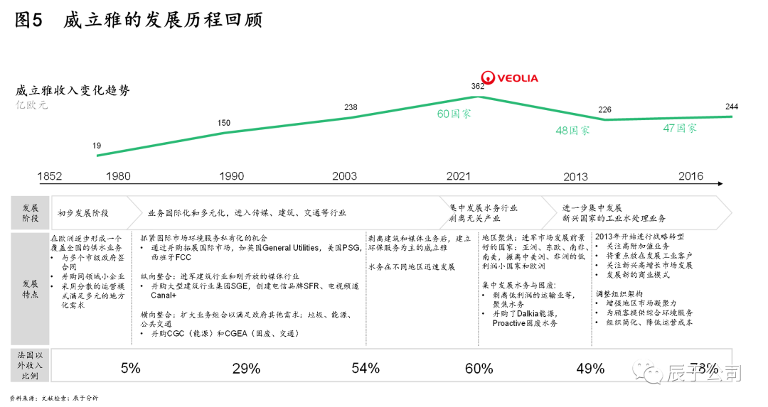 任何大企業(yè)的長成都不是一日之功,全球生態(tài)環(huán)保巨頭威立雅的發(fā)展之路照樣坎坷,歷經(jīng)160年發(fā)展,直到上世紀80年代后才真正開始走上快速發(fā)展的道路,經(jīng)歷了之后30年的擴張(見圖5)。