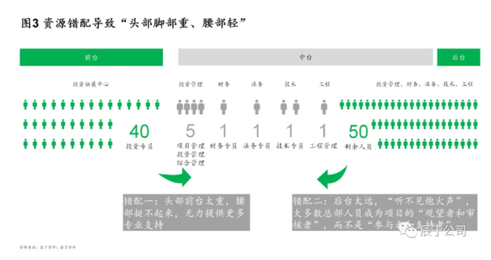 不難發(fā)現(xiàn),近年來一些企業(yè)開始“招兵買馬”,大量招聘投資拓展人員,這對于企業(yè)提高投資拓展能力自然是好事。不過我們也注意到,一些企業(yè)在投資相關(guān)的人員配置上卻不盡合理:他們通常把大量投資拓展人員“撒在前線”,同時(shí)建立“大后臺”,與投資相關(guān)的投管、財(cái)務(wù)、法務(wù),甚至技術(shù)、工程、運(yùn)營等人員主要負(fù)責(zé)項(xiàng)目質(zhì)量把關(guān)和風(fēng)險(xiǎn)管控,只有少量人員在中臺為前臺提供“彈藥”和支持(見圖3)。這種“頭重腳重”帶來兩個(gè)“錯(cuò)配”,一是頭部前臺太重,腰部挺不起來,無力提供更多專業(yè)支持;二是腳部后臺太遠(yuǎn),“聽不見炮火聲”,大多數(shù)人成為項(xiàng)目的“觀望者和審核者”,而不是“參與者和支持者”。