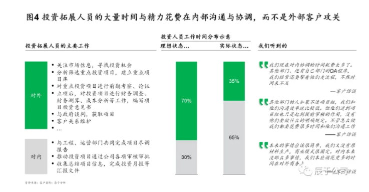 理想狀態(tài)下,對外對內(nèi)工作的時(shí)間分配比例應(yīng)該是7:3,甚至更高也不為過,但現(xiàn)實(shí)往往相反,由于內(nèi)部協(xié)同效率不高、流程繁冗、“人治”問題嚴(yán)重,我們發(fā)現(xiàn)一些投資拓展人員更多的時(shí)間與精力花費(fèi)在內(nèi)部溝通與協(xié)調(diào),而不是外部客戶攻關(guān)(見圖4)。造成這種現(xiàn)象的原因,表面看上去是內(nèi)部流程繁瑣,決策鏈條冗長,實(shí)則是內(nèi)部沒有形成一以貫之以市場為導(dǎo)向、以項(xiàng)目為核心的理念文化。平時(shí)大多只是喊喊口號而已,并未真正付諸行動。