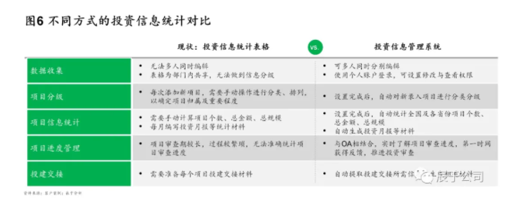 此外,我國生態(tài)環(huán)保產(chǎn)業(yè)數(shù)字化滲透率尚處于較低水平,即使是頭部企業(yè),也僅是在財(cái)務(wù)、行政、人力資源、工程等條線進(jìn)行了IT系統(tǒng)建設(shè),投資管理的IT系統(tǒng)建設(shè)很少,更別提利用大數(shù)據(jù)、機(jī)器學(xué)習(xí)、人工智能等先進(jìn)技術(shù)為投資決策提供支持了,不管是數(shù)據(jù)收集、還是項(xiàng)目分級、信息統(tǒng)計(jì)、進(jìn)度管理、投建交接等工作,基本依靠手動操作,效率低下且容易出錯(cuò)(見圖6)。