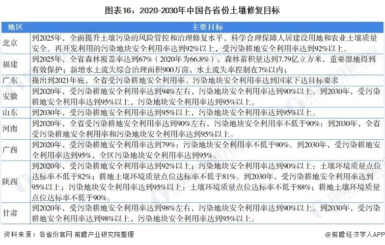 未來10年,我國主要省份也提出了土壤修復的發(fā)展目標。廣東省提出短期2021年土壤修復目標,北京、福建提出了到2025年土壤修復的目標,例如北京提出到2025年,再開發(fā)利用的污染地塊安全利用率達到92%以上,受污染耕地安全利用率達到92%以上。而安徽、山東、河南、廣西、陜西、甘肅等省份提出至2030年的土壤修復目標,例如安徽省指出到2030年,受污染耕地安全利用率達到95%以上,污染地塊安全利用率達到95%以上。
