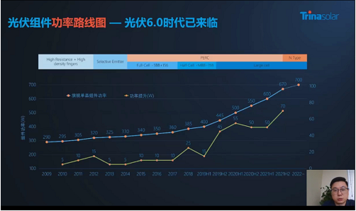 根據(jù)光伏組件功率路線圖顯示,光伏6.0時(shí)代已來(lái)臨。天合光能主要是在210mm 硅片、無(wú)損切割技術(shù)、低電壓設(shè)計(jì)、高密度封裝、多分片設(shè)計(jì)、MBB等幾大方面進(jìn)行創(chuàng)新。