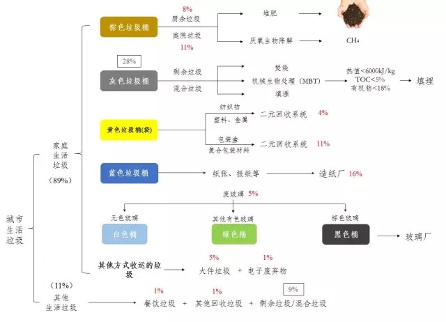 按照后續(xù)處理方式,生活垃圾又可分為分類收集的垃圾和剩余垃圾兩類。分類收集的垃圾包括廢紙、有機(jī)垃圾(殘余果蔬、園林垃圾等)、玻璃(分為棕色、綠色、白色)、輕質(zhì)包裝廢棄物、大件垃圾(廢舊家具)及廢舊金屬、廢舊電池等多種類型。剩余垃圾則是其它不可回收的殘余廢棄物。