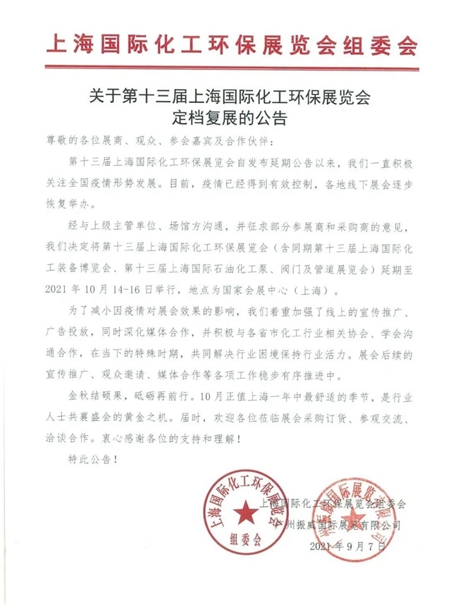 經(jīng)與上級主管單位、場館方溝通,并征求部分參展商和采購商的意見,我們決定將第十三屆上海國際化工環(huán)保展覽會(含同期第十三屆上海國際化工裝備博覽會、第十三屆上海國際石油化工泵、閥門及管道展覽會)延期至2021年10月14-16日舉行,地點為國家會展中心(上海)。