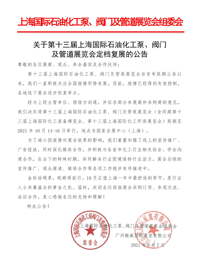 關(guān)于第十三屆上海國際石油化工泵、閥門及管道展覽會定檔復(fù)展的公告