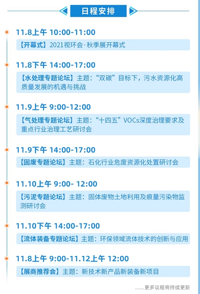 2021視環(huán)會(huì)·秋季展(第4屆)將于11月8—12日線上開展,同期開幕式、多場相關(guān)主題交流會(huì)議、活動(dòng)、新品發(fā)布會(huì)等將輪番舉行。本屆視環(huán)會(huì)同期在線論壇將以“創(chuàng)新助力高質(zhì)量發(fā)展 共謀環(huán)保產(chǎn)業(yè)‘雙碳’發(fā)展路徑”為主題,圍繞:市政污水處理、污泥處理處置、膜技術(shù)與高難度廢水處理、VOCs處理及大氣污染防治、環(huán)境監(jiān)測(cè)與服務(wù)、固體廢物資源化利用與處置、智慧節(jié)能等領(lǐng)域?qū)n}進(jìn)行探討。