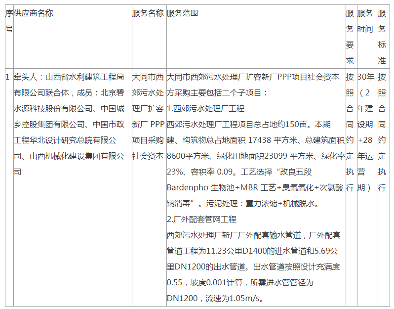 供應(yīng)商名稱:牽頭人:山西省水利建筑工程局有限公司聯(lián)合體,成員:北京碧水源科技股份有限公司、中國城鄉(xiāng)控股集團(tuán)有限公司、中國市政工程華北設(shè)計(jì)研究總院有限公司、山西機(jī)械化建設(shè)集團(tuán)有限公司