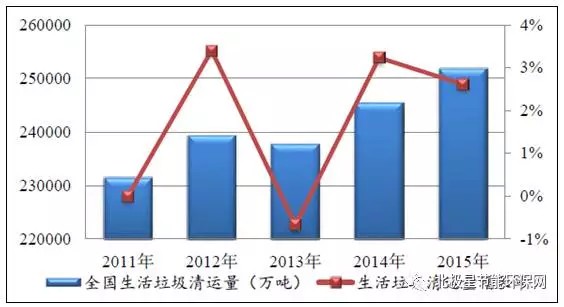 2011-2015年中國(guó)生活垃圾清運(yùn)量