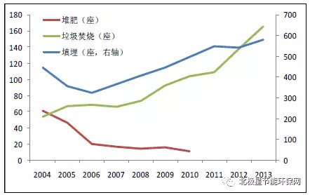 我國(guó)三種方式垃圾處理廠(chǎng)增長(zhǎng)情況(座)