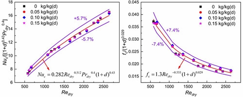 濕工質(zhì)中的含濕量顯著影響微通道回?zé)崞鞯膿Q熱性能,為了分析含濕量的定量影響,研究人員構(gòu)建了翼型-直通道新型耦合流動(dòng)換熱單元三維數(shù)理模型,討論了含濕量、流量和溫度等因素對耦合換熱的影響規(guī)律,對比了翼型結(jié)構(gòu)與直通道、之字形結(jié)構(gòu)的綜合流動(dòng)換熱性能。研究表明,增加含濕量可以提高高壓空氣的整體流動(dòng)換熱特性;在等泵功的條件下,交錯(cuò)排列的翼型翅片相比較于直通道和之字形通道具有最好的熱工水力特性?;诟晒べ|(zhì)經(jīng)驗(yàn)關(guān)聯(lián)式,引入含濕量強(qiáng)化換熱因子,建立了高溫含濕煙氣和高壓濕空氣流動(dòng)換熱特性與含濕量的定量關(guān)聯(lián)式,定量描述了含濕量對傳熱和壓降特性的影響規(guī)律(見圖2)。