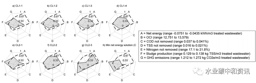 各類方案中可持續(xù)指標(biāo)評(píng)價(jià)一項(xiàng)以可持續(xù)碳中和運(yùn)行為目標(biāo)的積極分析表明,淹沒式厭氧膜生物反應(yīng)器(AnMBR)可能是凈能量明顯的,有利于形成碳負(fù)污水管理(Pretel et al.)。在該分析中,利用定量可持續(xù)設(shè)計(jì)過程,使用技術(shù)、環(huán)境和經(jīng)濟(jì)標(biāo)準(zhǔn)評(píng)估了全部可行的設(shè)計(jì)方案,來(lái)完善AnMBR詳細(xì)設(shè)計(jì)。其中,集成了跨季節(jié)溫度穩(wěn)態(tài)性能建模(使用中試實(shí)驗(yàn)數(shù)據(jù)和模擬軟 DESASS)、生命周期成本分析(LCC)和生命周期評(píng)價(jià)(LCA)。