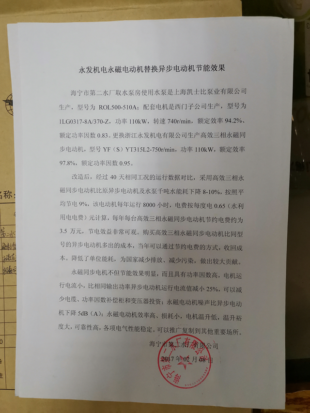 10年來永發(fā)先后為造紙、水泥、水利、鋼鐵、印染、軍工等行業(yè),千島湖飲水工程等項目貢獻了大量的高效高低壓電動機、超高效高低壓永磁同步產(chǎn)品,助力節(jié)能減排。其中很多產(chǎn)品都屬于首臺套,永發(fā)機電永磁直驅(qū)電機與智能化系統(tǒng)也被水利廳列入新技術(shù)推廣目錄。