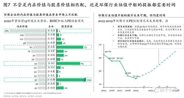 但必須承認(rèn)的是,向好趨勢(shì)的背后,我國(guó)資本市場(chǎng)的制度完善仍需時(shí)間。首先是生態(tài)環(huán)保企業(yè)內(nèi)在價(jià)值與股票價(jià)值的相匹配需要時(shí)間,在對(duì)生態(tài)環(huán)保企業(yè)2020年?duì)I收前15強(qiáng)的營(yíng)收、ROIC加權(quán)和PE倍數(shù)進(jìn)行分析得到,多數(shù)企業(yè)(如企業(yè)A、E、I、M)的內(nèi)在價(jià)值與股票價(jià)值在資本市場(chǎng)上并不匹配。其次是生態(tài)環(huán)保估值中樞的提升仍需時(shí)日,盡管隨著國(guó)家政策的提振、生態(tài)環(huán)保行業(yè)的發(fā)展、部分細(xì)分行業(yè)企業(yè)現(xiàn)金流狀況的改善,環(huán)保估值中樞提升未來(lái)可期,但也并不是一蹴而就的(見(jiàn)圖7)。