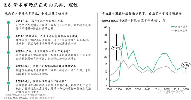政策推動(dòng)下,國(guó)內(nèi)資本市場(chǎng)改革逐步深化,制度建設(shè)日趨完善,生態(tài)環(huán)保企業(yè)面臨的資本市場(chǎng)大環(huán)境正走向理性。A股對(duì)H股的溢價(jià)逐步收窄便是其中一佐證:基于對(duì)95家同時(shí)在A股和港股上市的企業(yè)的分析,可以看到相比于2006年最高峰時(shí)A股對(duì)H股超過(guò)100%的溢價(jià),當(dāng)前30%-40%的溢價(jià)已有明顯收窄(見(jiàn)圖6)。