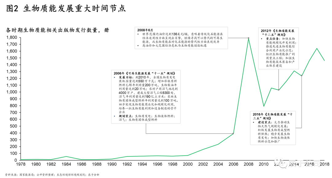 然而總的來說,生物質(zhì)能發(fā)展的時(shí)間并不長(zhǎng),21世紀(jì)以前這個(gè)領(lǐng)域的相關(guān)研究極少,我國也直到“十一五”才首次將其納入規(guī)劃范圍。2008年石油危機(jī)促使人類開始尋找替代能源,生物質(zhì)能也逐漸成為一個(gè)重要的選項(xiàng)(見圖2)。