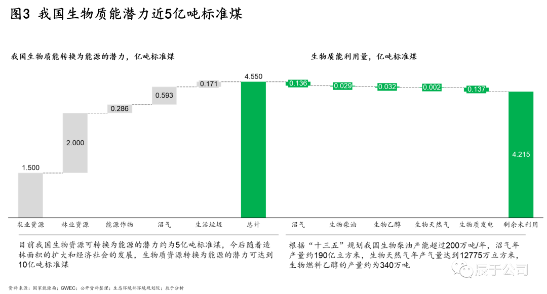 正因如此,我國生物質(zhì)能還處于發(fā)展的初級(jí)階段,潛力巨大。根據(jù)公開資料測(cè)算,當(dāng)前我國生物質(zhì)能每年可以利用的量將近5億噸標(biāo)準(zhǔn)煤,相較之下目前已經(jīng)利用的量只有不到0.4億噸標(biāo)準(zhǔn)煤,生物質(zhì)能是一座待持續(xù)發(fā)掘的能源寶庫,行業(yè)還有十幾倍的增長(zhǎng)空間。