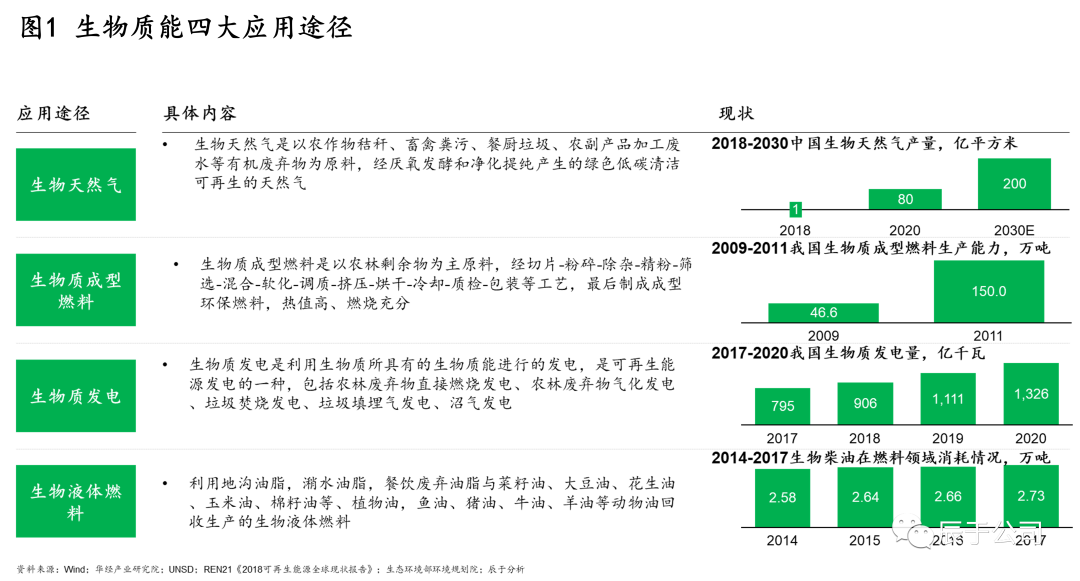 生物質(zhì)能是指太陽能以化學(xué)能形式儲(chǔ)存在生物質(zhì)中的能量形式,燒柴火便是對(duì)生物質(zhì)能的利用,自從人類學(xué)會(huì)了使用火,生物質(zhì)能就成為重要的能源來源之一?,F(xiàn)代生物質(zhì)能行業(yè)進(jìn)一步對(duì)各種有機(jī)質(zhì)中的能源進(jìn)行加工和轉(zhuǎn)換,變成各類更易儲(chǔ)存、運(yùn)輸和使用的能源類型,具體可分為四大類別:生物天然氣,生物質(zhì)發(fā)電,生物質(zhì)成型燃料,生物液體燃料。這四類均已有一定的發(fā)展基礎(chǔ)(見圖1)。