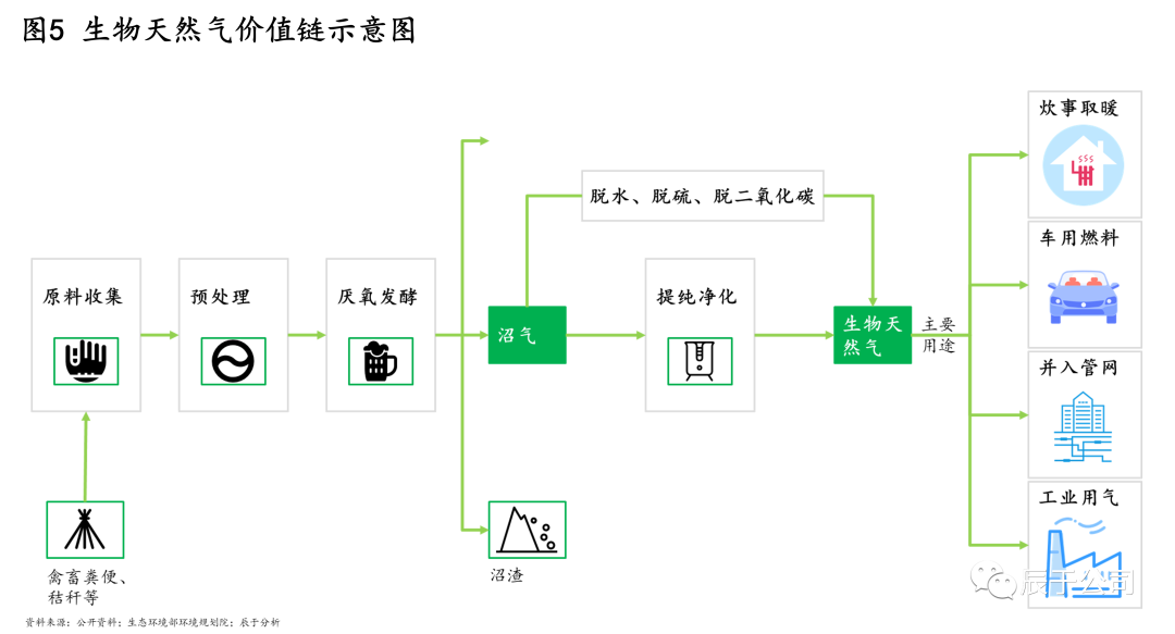 生物天然氣是指通過對(duì)秸稈、人畜糞便等生物質(zhì)經(jīng)過發(fā)酵形成沼氣后,進(jìn)一步提純獲得的天然氣,作為天然氣的替代品用于家庭炊事取暖、車用燃料、工業(yè)用氣等領(lǐng)域,它的價(jià)值鏈較長(zhǎng)(見圖5)。